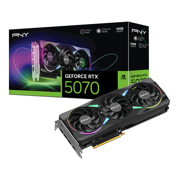 PNY GeForce RTX 5070 12GB GDDR7 ARGB Triple Fan là mẫu card đồ họa thế hệ mới sử dụng kiến trúc NVIDIA Blackwell mạnh mẽ, kết hợp bộ nhớ GDDR7 tốc độ cao 28Gbps và hệ thống làm mát Triple Fan ARGB hiện đại. Đây là lựa chọn lý tưởng cho game thủ, nhà sáng tạo nội dung, streamer và designer cần một hiệu năng vượt trội cùng khả năng xử lý hình ảnh mượt mà.